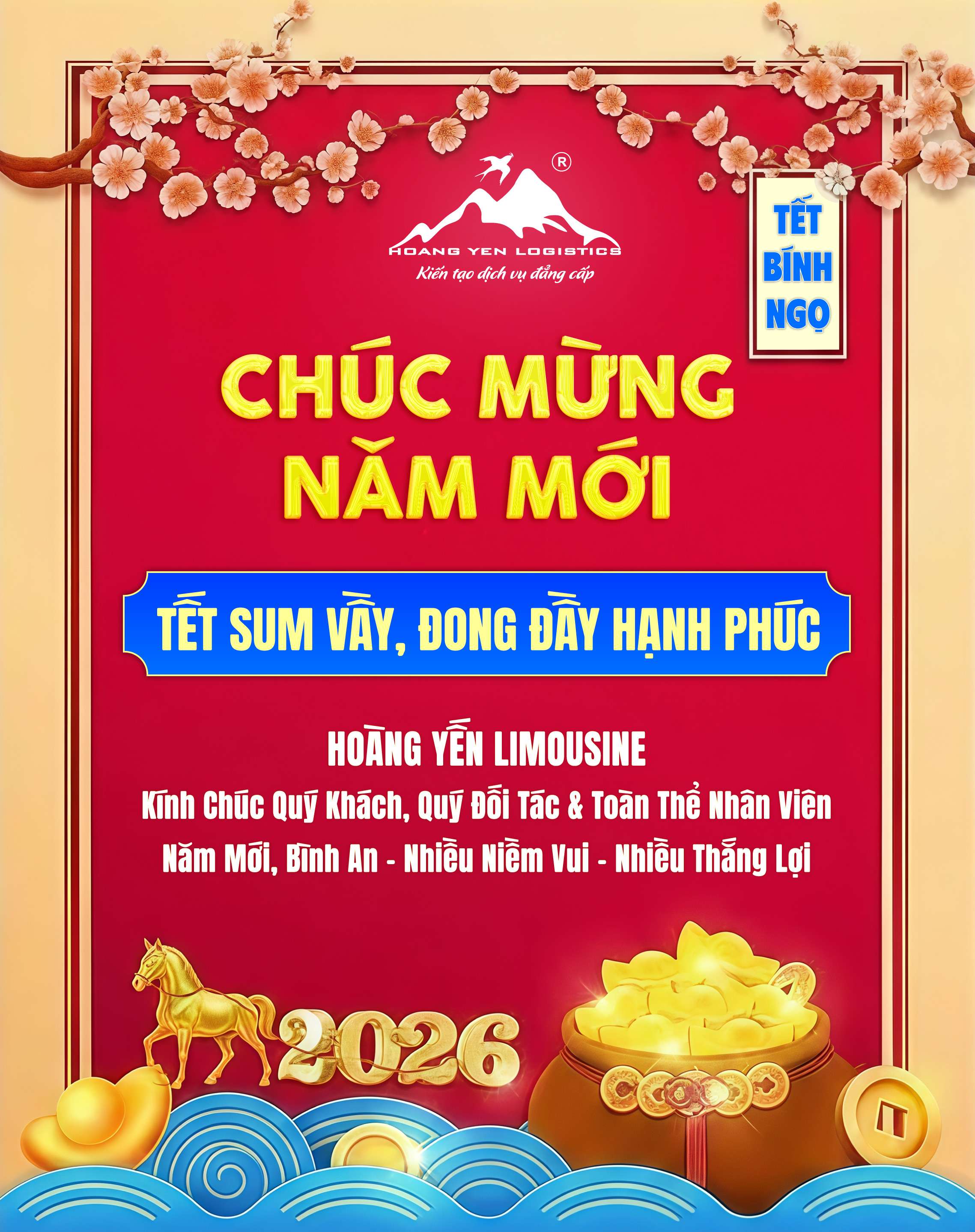 Hoàng Yến Logistics kính chúc Quý khách một mùa Xuân Bính Ngọ 2026 an vui, sum vầy và trọn vẹn hạnh phúc. Cảm ơn sự đồng hành quý báu trong suốt năm qua và mong tiếp tục mang đến dịch vụ uy tín – tận tâm – chuyên nghiệp.